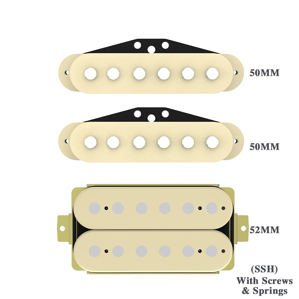 This is a SSH pickup set comes with two 50mm single coil pickup and one 52mm humbucker pickup.The single coil pickups are good replacement for ST style guitar NECK&MIDDLE position, the ceramic magnet double coil guitar humbucker pickup,12 non-adjustable slug pole pieces ,ideal for electric guitar BRIDGE position.